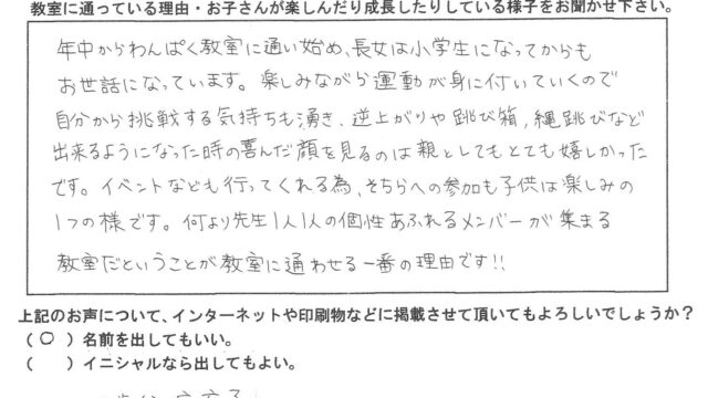 お客様の声(保護者の方) 先生1人1人が個性あふれるメンバー 2026年1月23日 kinoii_admin https://www.k-hitsuji.net/wp-content/uploads/2020/10/logo.png きのいい羊達 年中からわんぱく教室に通い始め、長女は小学生になってからも お世話になっています。楽しみながら運動が身に付いていくので 自分から挑戦する気持ちも湧き、逆上がりや跳び箱、 …