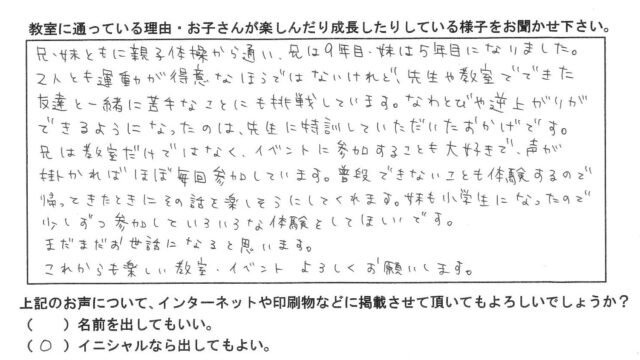 お客様の声(保護者の方) 兄は9年目・妹は5年目になりました。 2026年1月23日 kinoii_admin https://www.k-hitsuji.net/wp-content/uploads/2020/10/logo.png きのいい羊達 兄・妹ともに親子体操から通い、兄は9年目・妹は5年目になりました。 2人とも運動が得意なほうではないけれど、先生や教室でできた 友達と一緒に苦手な事にも挑戦しています。 …